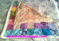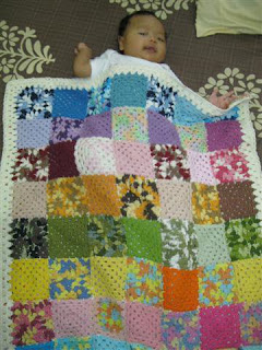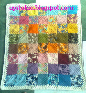 This blanket is a present for a member in Dinamic Crochet Community, Yani, who gave birth in last August. I received the squares from my friends and my task is to join the squares into a blanket. It consist of 56 squares. I sew Japanese cotton fabric behind it so both sides can be used .
